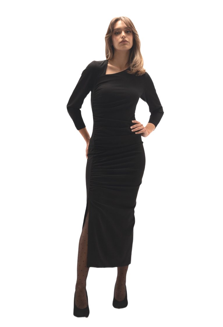 Φόρεμα Μάξι pencil με ασύμμετρη λαιμόκοψη, με σούρες στην μέση και στους γοφούς και άνοιγμα στο κάτω μέρος. 97%PL3%EL