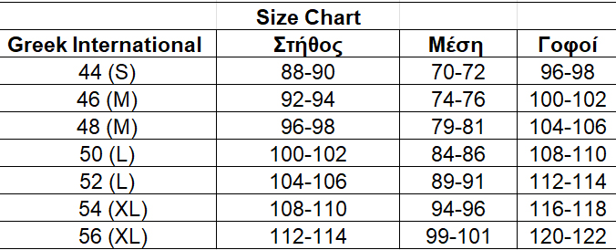 | Μέγεθος | 46, 48, 50, 52, 54, 56 |